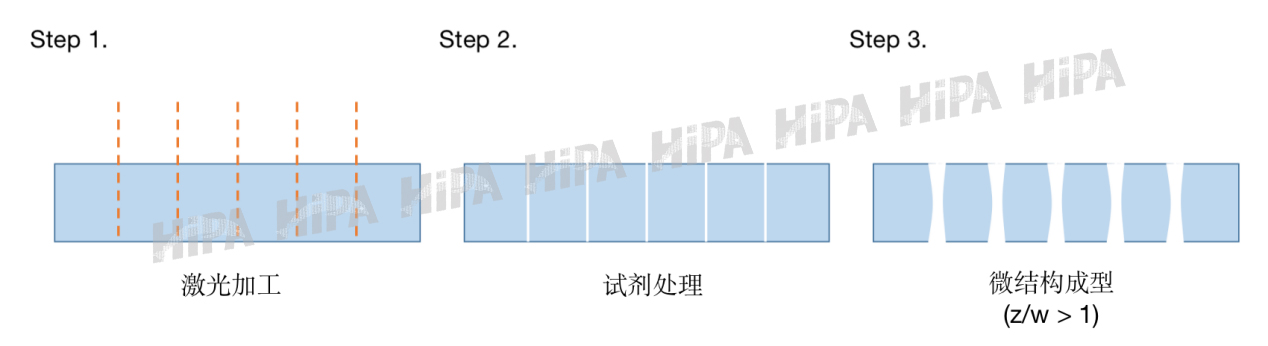 激光引導深層腐蝕(LIDE)很好的解決了以上問題。LIDE是一種能在玻璃上方便、快捷、低成本加工深層微型功能結構的新型技術:先使用激光在玻璃上生成預先設計、具有功能性結構的微孔,然后擴大微孔以形成需要的結構。由此制造的成品無崩邊、無微裂痕、無熱應力,可以廣泛應用于顯示玻璃倒邊,陣列微孔,集成電路封裝,折疊顯示屏。
