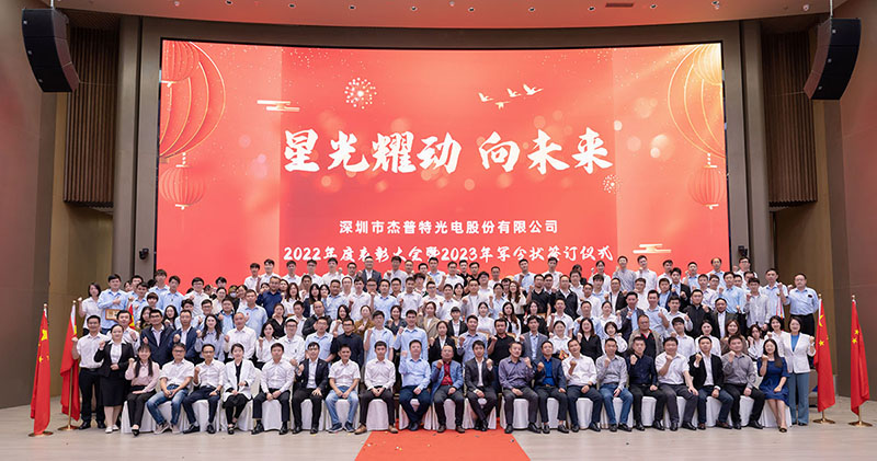 星光耀動,向未來。3月11日,深圳市杰普特光電股份有限公司2022年度表彰大會暨2023年軍令狀簽訂儀式在捷順國際會議廳隆重舉行。董事長黃治家、總經理劉健、副總經理成學平、杰普特管理層,與全體員工歡聚一堂,為杰普特在剛剛過去的2022年所取得的成就慶賀,也為贏戰充滿希望且更具挑戰的2023而祝福。