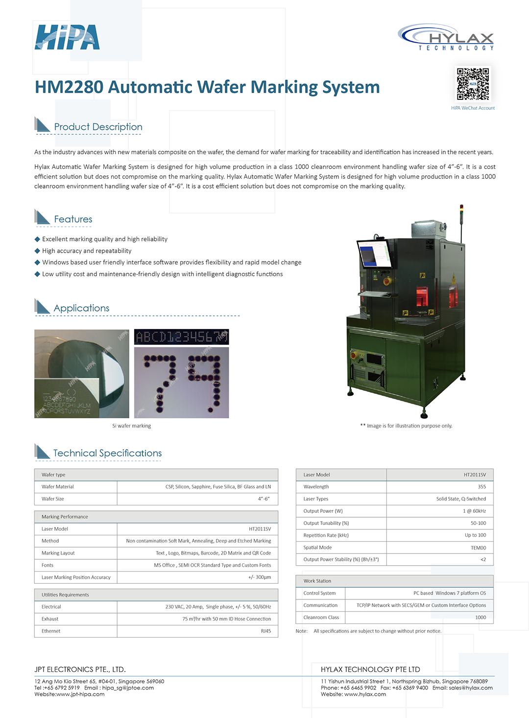 Hylax Automatic Wafer Marking System is designed for high volume production in a class 1000 cleanroom environment handling wafer size of 4”-6”. It is a cost efficient solution but does not compromise on the marking quality. Hylax Automatic Wafer Marking System is designed for high volume production in a class 1000 cleanroom environment handling wafer size of 4”-6”. It is a cost efficient solution but does not compromise on the marking quality.