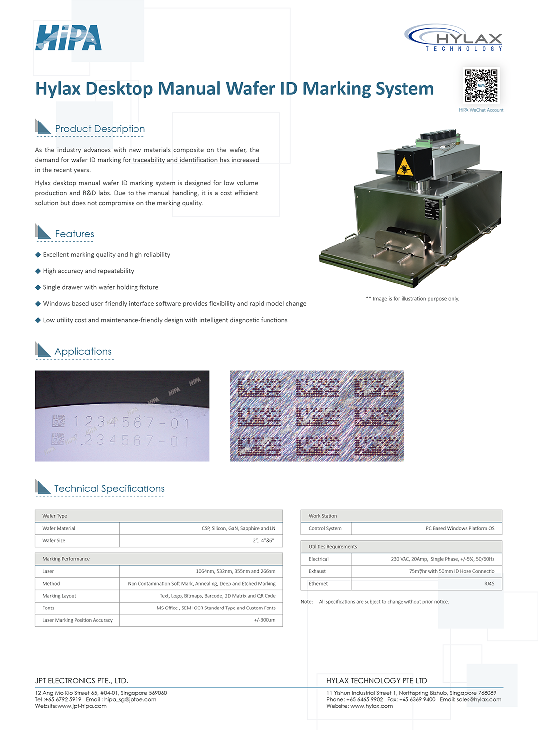 Hylax desktop manual wafer ID marking system is designed for low volume production and R&D labs. Due to the manual handling, it is a cost efficient solution but does not compromise on the marking quality.