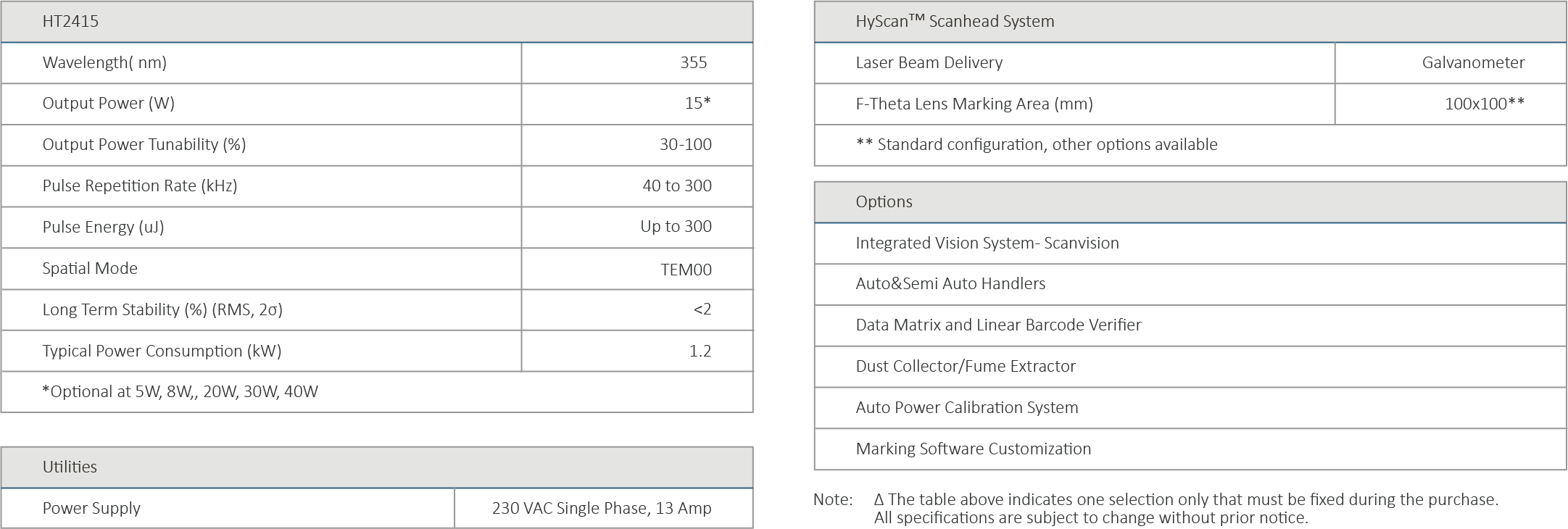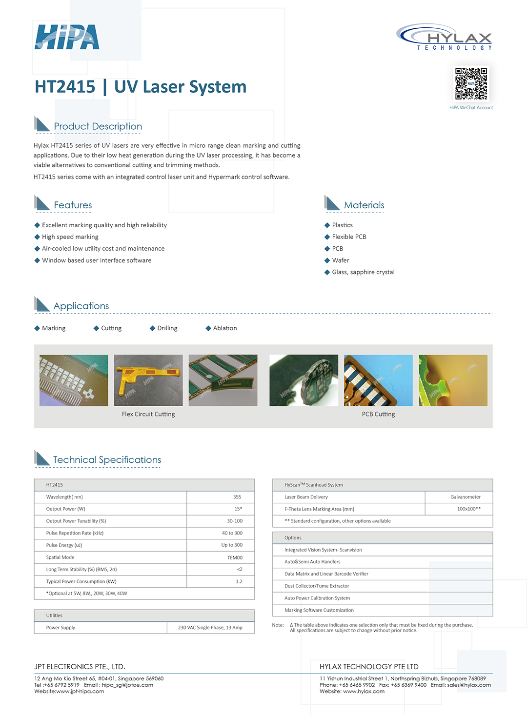 Hylax HT2415 series of UV lasers are very effective in micro range clean marking and cutting applications. Due to their low heat generation during the UV laser processing, it has become a viable alternatives to conventional cutting and trimming methods.